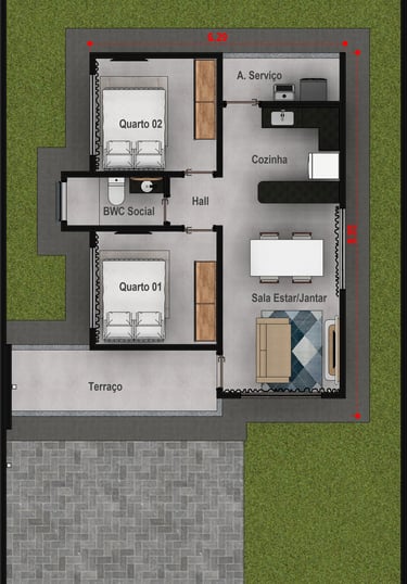 Sala de Estar/Jantar Integrados com Cozinha - 2 Dormitórios - 1 Banheiro Social - Área de Serviço coberta - Terraço